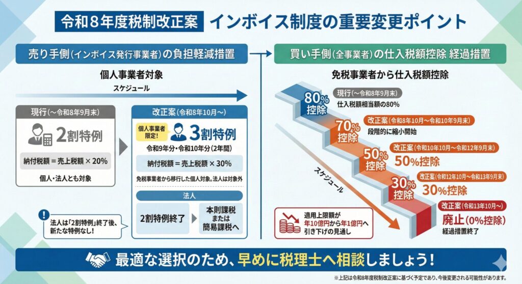 【令和8年度税制改正】インボイス「2割特例」の後はどうなる?個人事業主に配慮した「3割特例」が新設へ!