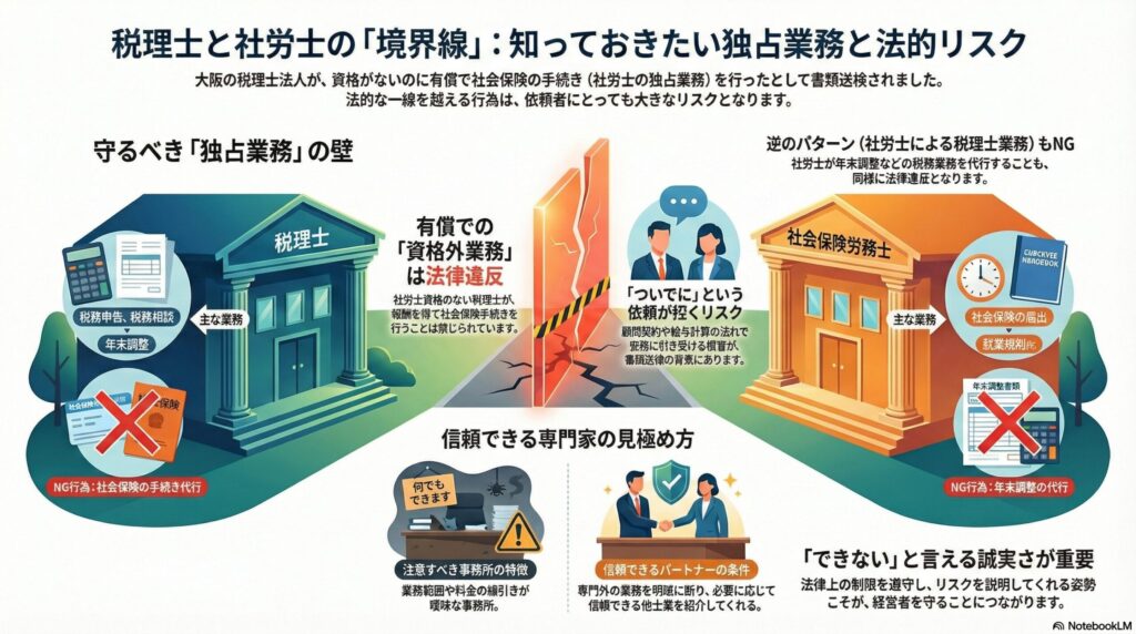 税理士法人の代表や部下が書類送検されたというニュース 先日、大阪の税理士法人の代表らが、社会保険労務士法違反の疑いで書類送検されたというニュースが報じられまし... -