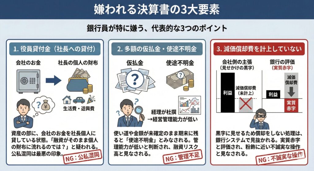 銀行は、適正に減価償却を行った上での利益で会社を評価します。償却をせずに無理やり出した黒字は、銀行から見れば実質赤字であり、さらに「粉飾に近い操作をして良く見せようとしている」という不誠実な印象を与えてしまいます。