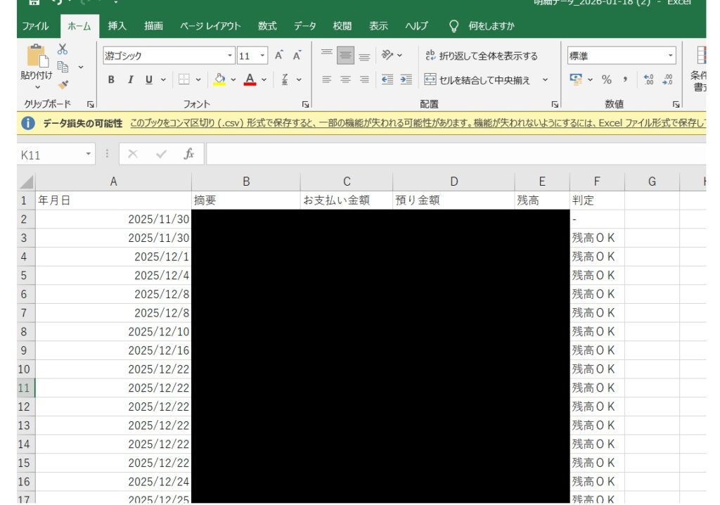 csvデータがダウンロードできました✨これを、残高・残高OKを削除して会計ソフトに読み込ませれば仕訳できちゃいます♪