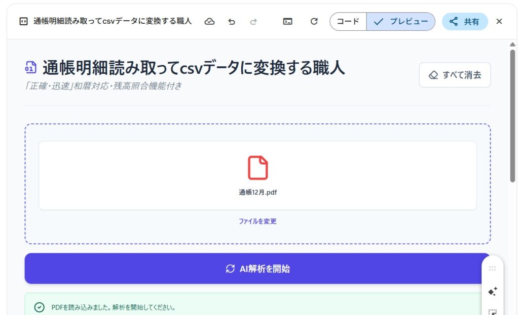 PDFを読み取った後、AI解析を開始のボタンが押せるようになるので、押します。