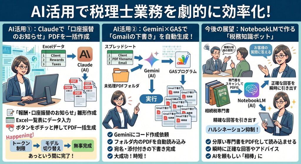 しかし、一人事務所で全てを手作業で行っていては、あっという間に時間が過ぎてしまいます。そこで今回は、最新のAIツールを活用して、圧倒的な業務効率化(時短)を実現した方法をご紹介します!